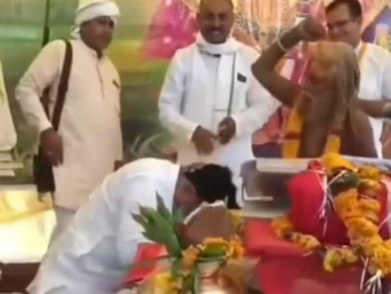पूरा मामला भिंड जिले के बेरछा गांव का है. यहां भगवत कथा का आयोजन किया गया था. इस दौरान सेवढ़ा से बीजेपी विधायक प्रदीप अग्रवाल बाबा सीताराम महाराज का आशीर्वाद लेने पहुंचे थे. विधायक ने बाबा को सम्मानित करते हुए माला पहनाई. पहले तो बाबा कुछ नहीं बोले, लेकिन तभी अचानक बाबा को गुस्सा आ गया और उन्होंने विधायक की पीठ पर मुक्के मारने शुरू कर दिए. इसके विधायक को हटाते हुए बाबा ने धक्का भी दे दिया. इतना ही नहीं विधायक ने जो माला बाबा को पहनाई थी, उन्होंने वह माला भी फेंक दी|