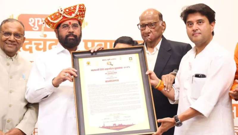 नई दिल्ली । राकांपा (शरद) नेता शरद पवार ने उपमुख्यमंत्री एकनाथ शिंदे को एक समारोह में महादीराज शिंदे राष्ट्रीय गौरव पुरस्कार से सम्मानित किया है। मंगलवार को दिल्ली में 98वें अखिल भारतीय मराठी साहित्य सम्मेलन के अवसर पर एकनाथ शिंदे को शरद पवार से पुरस्कार मिला। अपने संबोधन में एकनाथ शिंदे ने बताया कि उनके शरद पवार के साथ अच्छे संबंध हैं। ये पुरस्कार सरहद नाम की संस्था देती है। हर साल किसी एक विशिष्ट व्यक्ति को महादीराज शिंदे राष्ट्रीय गौरव पुरस्कार दिया जाता है। इस बार एकनाथ शिंदे को पुरस्कार मिला। दिल्ली के महाराष्ट्र सदन में आयोजित समारोह में ज्योतिरादित्य सिंधिया भी मौजूद थे। इस दौरान एकनाथ शिंदे ने शरद पवार की और शरद पवार ने एकनाथ शिंदे की भी जमकर तारीफ़ की। अब शरद पवार के हाथों शिंदे को मिले सम्मान के बाद वाद-विवाद शुरू हो गया है।